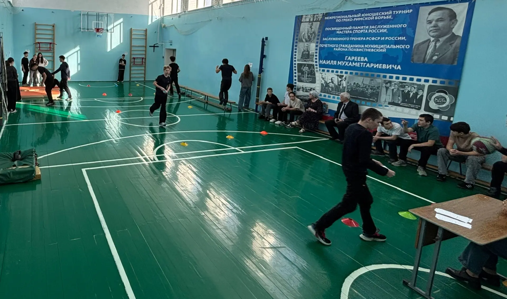 Имеется спортивное оборудование: гимнастическое бревно, гимнастические скамейки, «шведские стенки», баскетбольные щиты с кольцами, сетка для волейбола, гимнастические маты, гимнастический козел. Раздевалки в удовлетворительном состоянии.